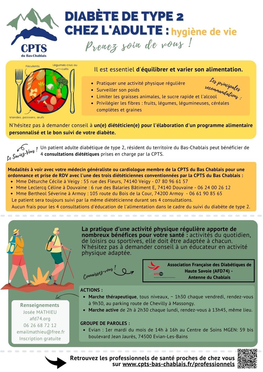 La patient diabétique doit entrer dans le parcours de prise en charge du patient adulte diabétique de type 2 de la CPTS du Bas Chablais, grâce à son médecin traitant qui le déclare auprès de la coordinatrice de la CPTS. Fiche de déclaration adulte diabétique de type 2.